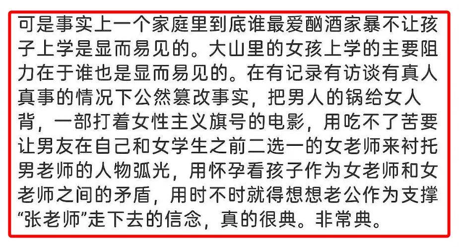 一些网友指出,在电影中女孩们被描绘为不学习、贪玩、逃学逛街购物,上课睡觉不看书。这种表现似乎将女性同学的个性简化成了一种刻板印象,忽略了她们多才多艺、努力奋斗的一面。同样,电影中女孩家庭不妥当的描绘也引起了争议,将女孩的妈妈塑造成酗酒、不做家务、不干农活、甚至家暴的形象,与真实事件中女孩爸爸酗酒家暴的事实存在明显出入。