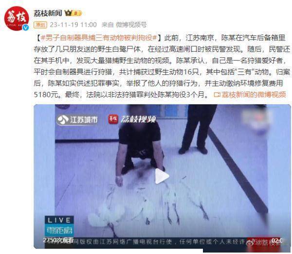 此前,江苏南京,陈某在汽车后备箱里存放了几只朋友送的野生白鹭尸体,在经过高速闸口时被民警发现。随后,民警还在其手机中,发现大量猎捕野生动物的视频。陈某承认,自己是一名狩猎爱好者,平时会自制器具进行狩猎,共计捕获过野生动物16只,其中包括“三有”动物。归案后,陈某如实供述犯罪事实,举报了他人的狩猎行为,并主动缴纳环境修复费用5180元。最终,法院以非法狩猎罪判处陈某拘役3个月。
