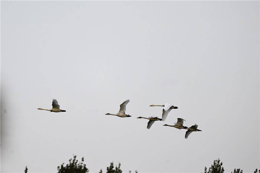 成群天鹅在白洋淀上空飞过。张学农摄