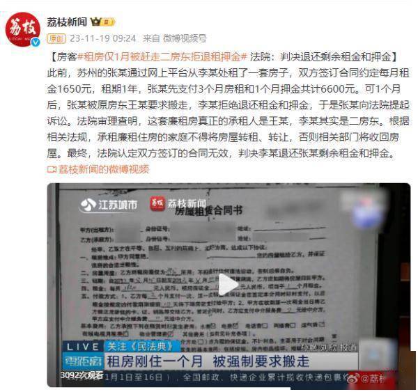 原标题:房客租房仅1月被赶走,二房东拒退租押金 法院:判决退还剩余租金和押金