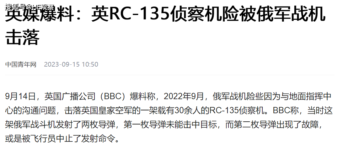 俄军飞行员误会了地面控制人员的话,苏-27战斗机向皇家空军RC-135侦察机发射了两枚空空导弹,好在这两枚导弹并未击中目标,否则,这架RC-135侦察机极可能被击落,机上的30多人也会死亡,在这种情况下,俄罗斯极可能与英国以及北约开战,击落有人驾驶的侦察机可不像击落“全球鹰”这样的无人机,人员死亡是北约的底线。