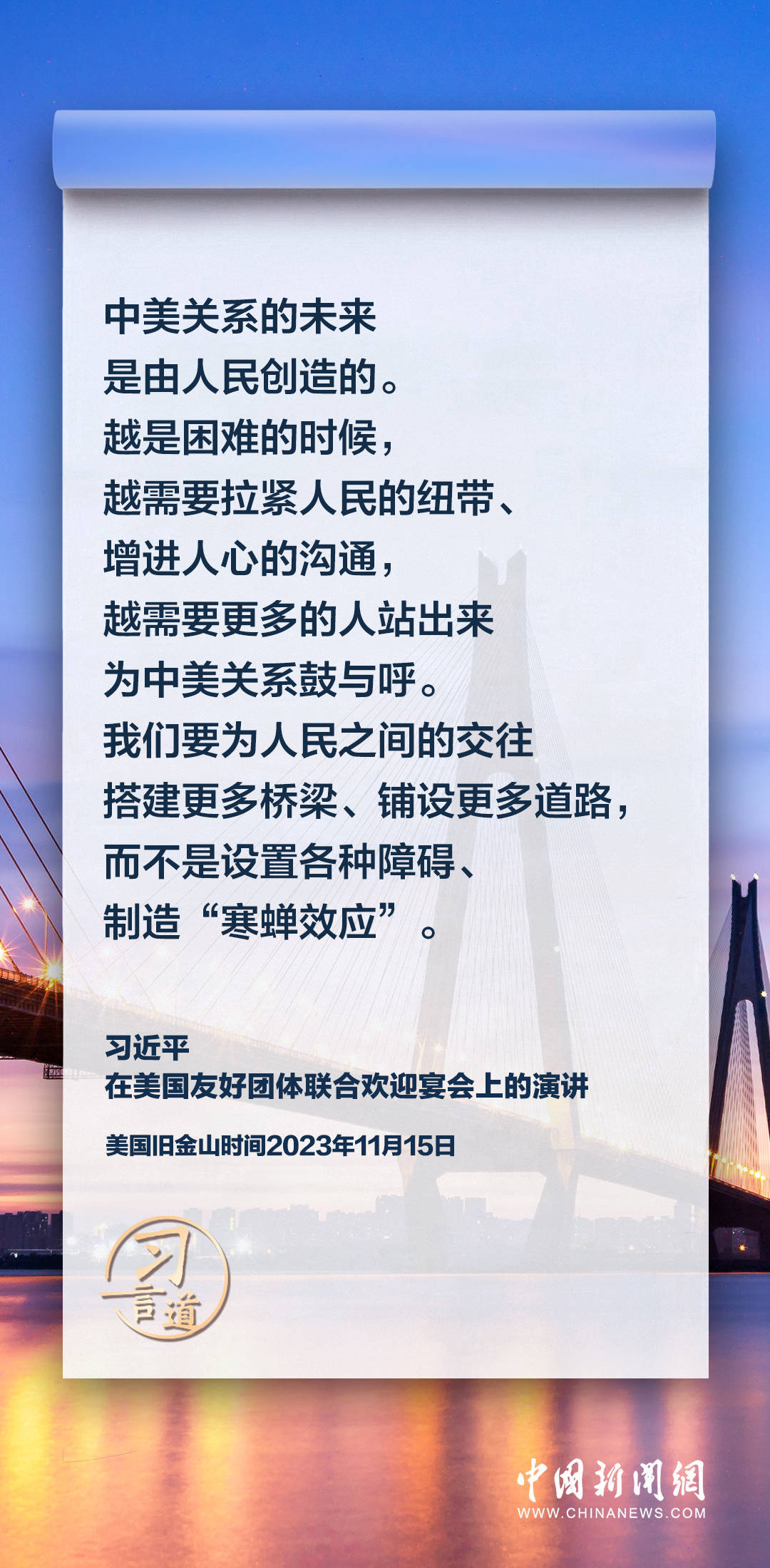 当地时间11月15日,中国国家主席习近平在美国旧金山出席美国友好团体联合欢迎宴会并发表演讲。习近平在演讲中从“我”和“我们”说起,提出中国主张、表明中国立场、展现大国担当,话语掷地有声。