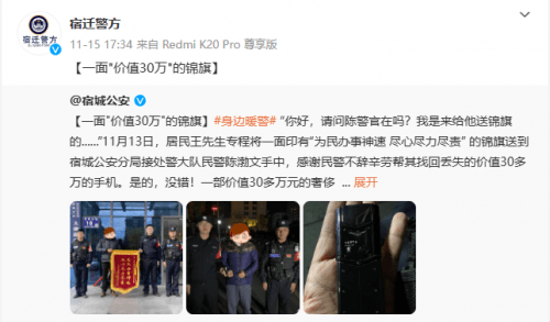 这部价值30万元手机的失而复得,不日也在社交媒体上引起了热议。有网友感慨道:“警察叔叔效率真是太赞了,比我买手机还快”,同时也有网友调侃说:“这丢的不是手机,是我的首付”,就连王先生送去的锦旗也被网友称为“史上最贵锦旗”、“一面价值30万的锦旗”。