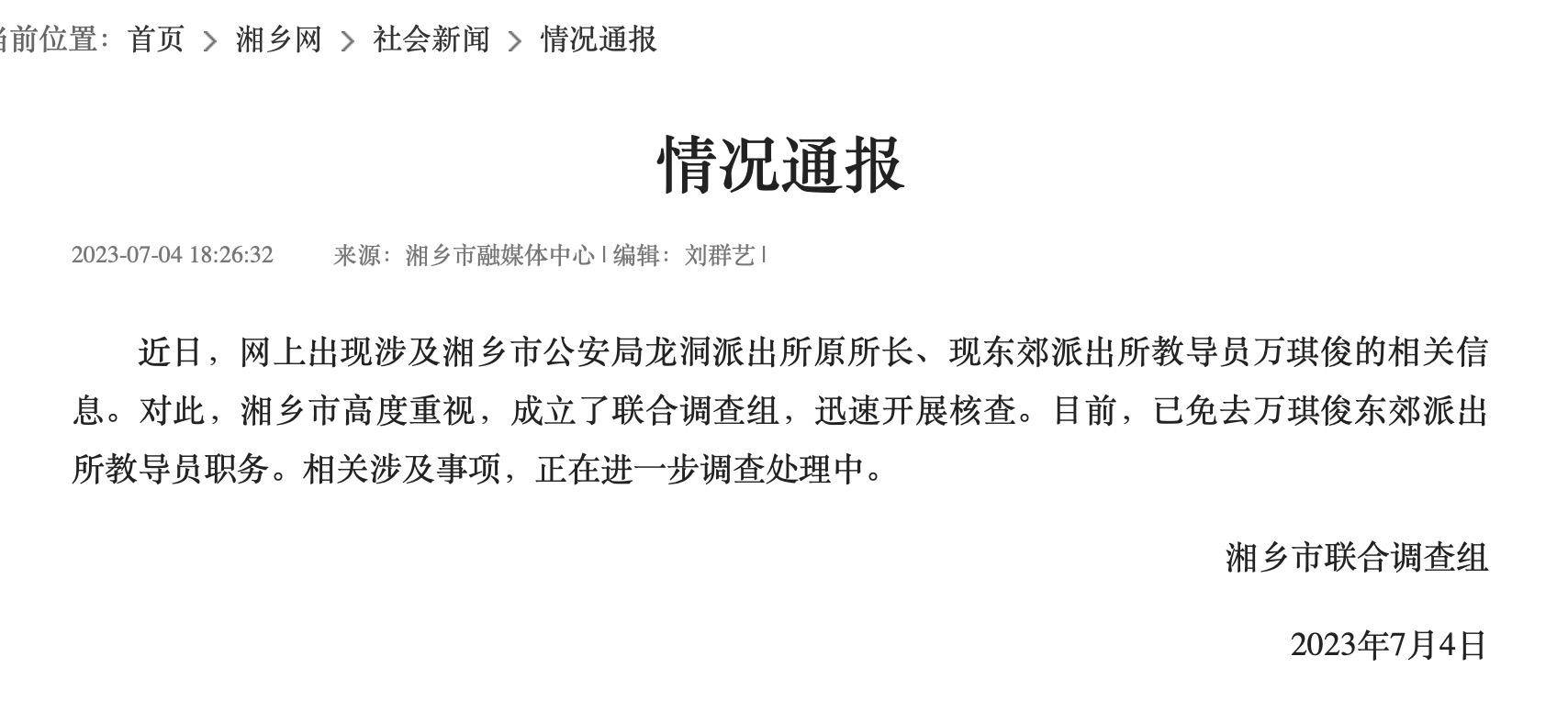 7月4日,湘乡市联合调查组发布《情况通告》称,近日,网上出现涉及湘乡市公安局龙洞派出所原所长、现东郊派出所教导员万琪俊的相关信息。对此,湘乡市高度重视,成立了联合调查组,迅速开展核查。目前,已免去万琪俊东郊派出所教导员职务。相关涉及事项,正在进一步调查处理中。