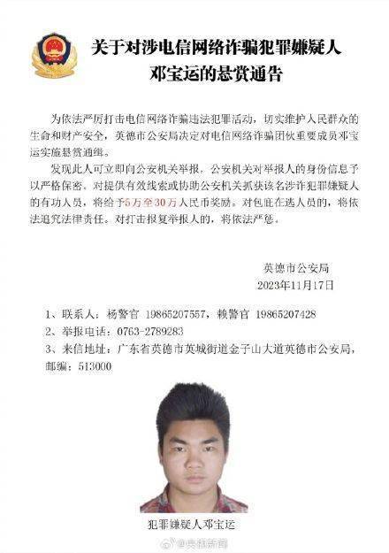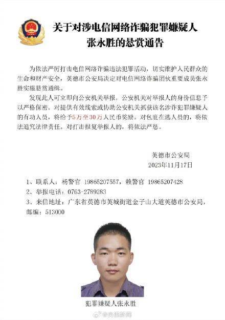 近日,广东英德市公安局对电信网络诈骗团伙重要成员张永胜、丘小雄、徐培星、张方文、巫昌发、邓宝运、邓海坚实施悬赏通缉。发现上述人员立即向公安机关举报,对提供有效线索或协助公安机关抓获该名涉诈犯罪嫌疑人的有功人员,将给予5万至30万人民币奖励。看到这7个人报警最高奖励30万元
