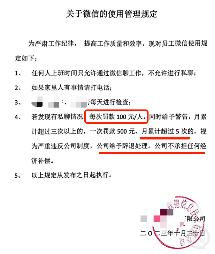 近日,哈尔滨一家公司发布关于员工微信的使用管理规定,“若发现私聊微信,每次罚款100元/人”。通知里说的微信不是企业微信,而是平时用的个人微信。