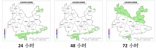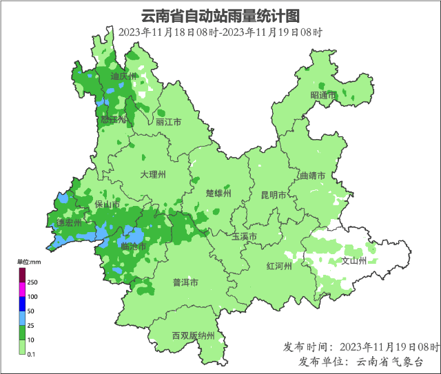 11月19日20时到11月20日20时:昭通市北部、普洱市南部、西双版纳州、红河州、文山州多云有分散阵雨,其他地区晴间多云。