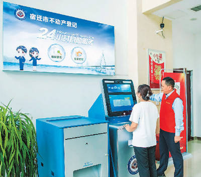 近年来,江苏省宿迁市不动产登记中心宿城分中心把方便群众办事作为服务落脚点,积极推行预约办、网上办、延时办、上门办、专窗办、邮政办等一系列便民暖心举措,提供多元化、便捷化服务。图为在宿城分中心不动产登记24小时自助服务厅内,工作人员通过自助综合查询终端指导市民办理业务。 徐江海摄(人民图片)