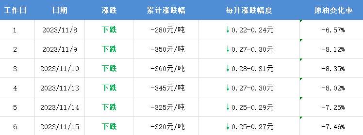 11月17日,国内第8个工作日参考原油变化率为-8.10%,预计汽柴油下调350元/吨,折算后合0.27-0.30元/升。按当前幅度计算,加满50L的油箱,将节省13.5-15元。