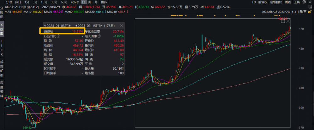 9月15日,上海期货交易所黄金期货主力合约(AU2312)价格盘中一度突破480元/克,续创上市15年以来的新高。截至9月15日,Wind金融终端显示,下半年以来沪金期货价格涨超4%,今年以来已累计涨近14%。