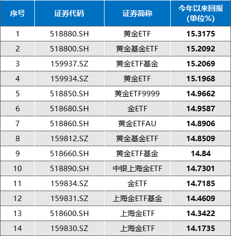 境内黄金ETF净值也不断刷新高点。Wind金融终端数据显示,截至9月15日收盘,境内14只黄金ETF今年以来平均回报率达到14.85%,最高突破15%,近期净值均创下年内新高。与此对应的是,大量资金正涌入黄金ETF,令黄金ETF在二级市场几乎都呈现溢价交易。
