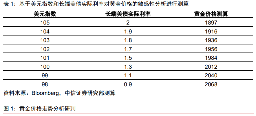 中信证券在研报中指出,实际利率下行将是驱动黄金上行的核心原因。在其他因素不变的前提下,美元指数上(下)行一个点位,黄金下(上)行约12美元。长端美债实际利率上(下)行10bps,黄金下(上)行约8美元。