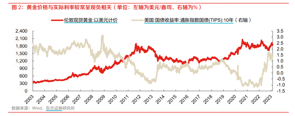 黄金作为贵金属,价格走势主要受其金融属性影响。黄金价格与美国国债实际利率走势负相关。