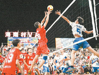 在被称为“村排”的2023年海南(文昌)乡镇排球联赛决赛中,东郊镇队(右)对阵东阁镇队。 新华社记者 蒲晓旭摄