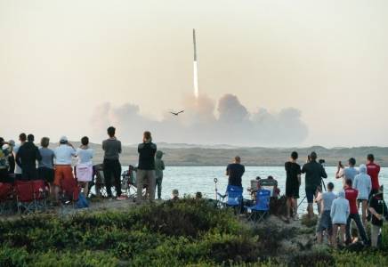 11月18日,在美国得克萨斯州南帕德里岛,人们观看“星舰”火箭发射。新华社发