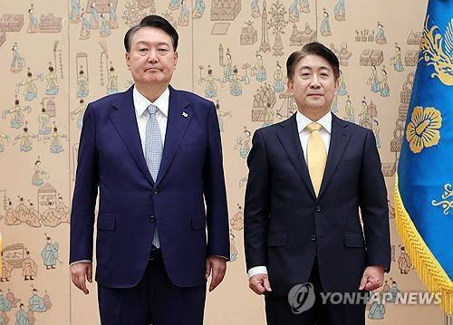 8月25日,在龙山总统府,总统尹锡悦(左)向新任放送通信委员会委员长李东官颁发任命书后与其合影留念。 韩联社/总统室通信摄影记者团