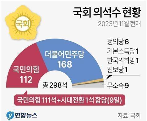 韩国国会议席示意图,统合民主党168席,国民力量阵营112席