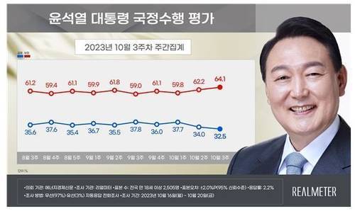 2023年8月第三周至10月第三周尹锡悦民调,蓝色为对施政持肯定态度,红色为否定