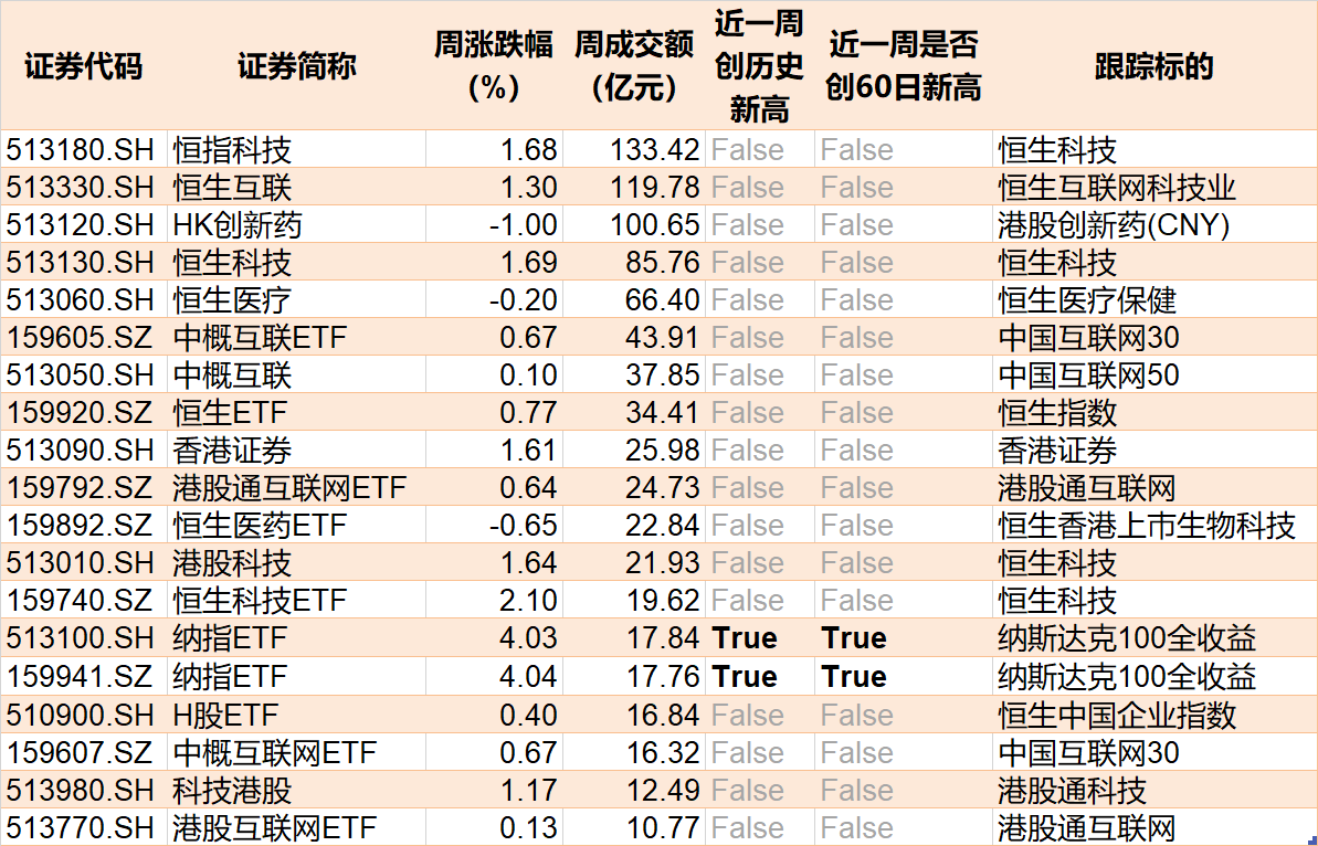 跨境ETF上周成交额超过10亿元的有19只,其中恒指科技、恒生互联、HK创新药周成交额突破100亿元。