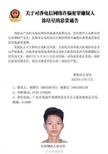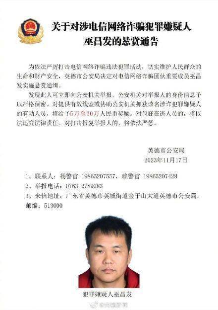 近日,广东英德市公安局对电信网络诈骗团伙重要成员张永胜、丘小雄、徐培星、张方文、巫昌发、邓宝运、邓海坚实施悬赏通缉。发现上述人员立即向公安机关举报,对提供有效线索或协助公安机关抓获该名涉诈犯罪嫌疑人的有功人员,将给予5万至30万人民币奖励。(英德公安)