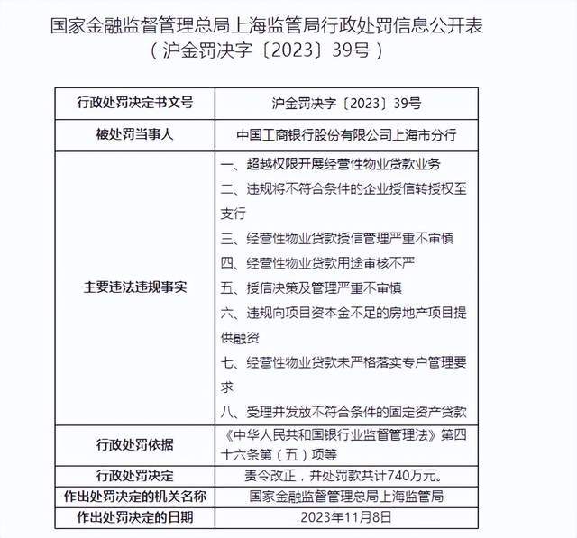 具体而言,工行上海分行因超越权限开展经营性物业贷款业务、违规将不符合条件的企业授信转授权至支行、经营性物业贷款授信管理严重不审慎、经营性物业贷款用途审核不严、授信决策及管理严重不审慎、违规向项目资本金不足的房地产项目提供融资、经营性物业贷款未严格落实专户管理要求、受理并发放不符合条件的固定资产贷款共“八宗罪”被罚740万元。