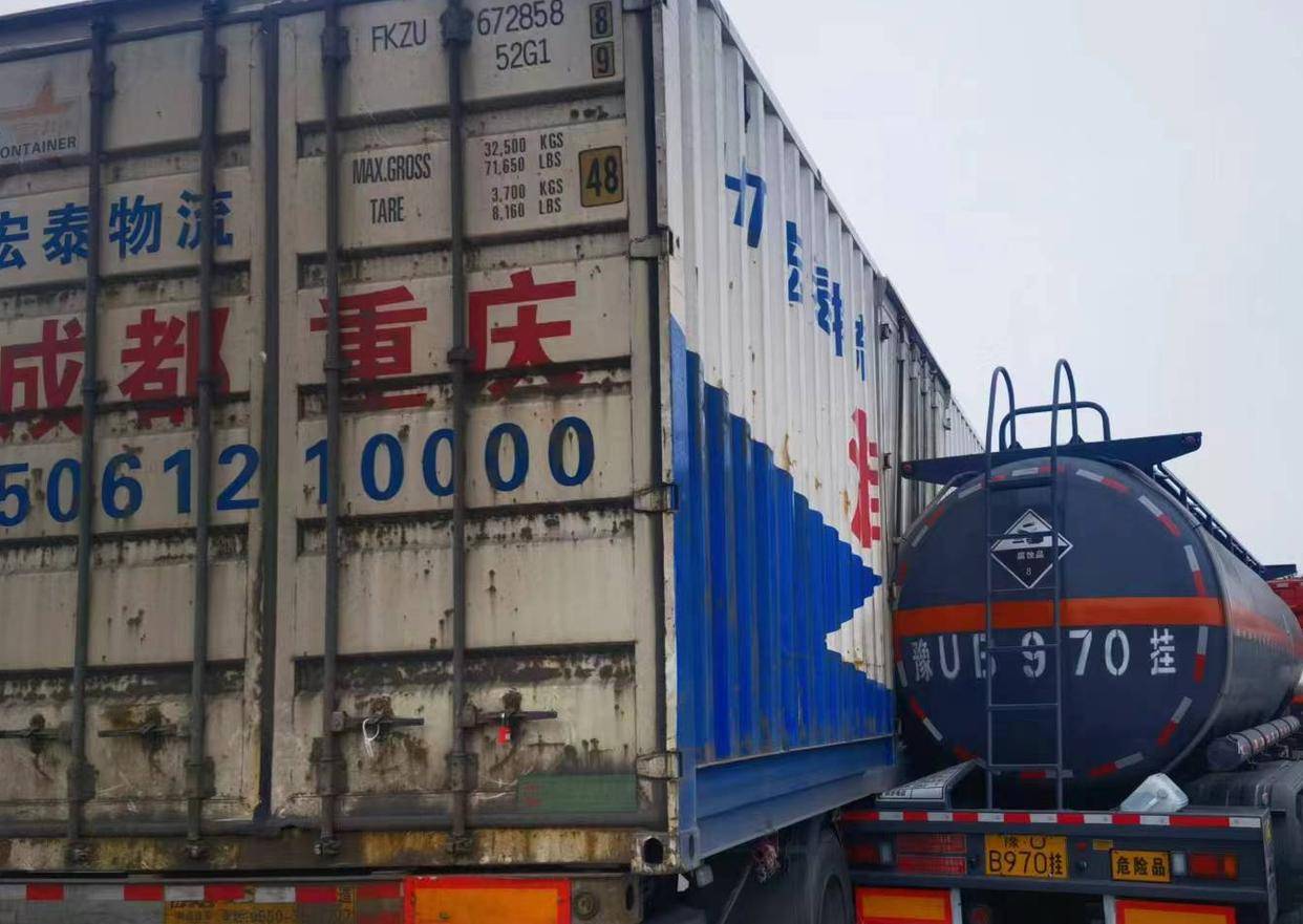 事件:11月10日上午9时28分,南阳新野服务区西区停车场一辆物流大货车碰撞上一辆先行进场停靠的危化品运输罐车,两车车尾紧紧“契合”在一起动弹不得。