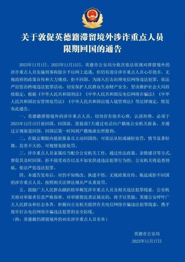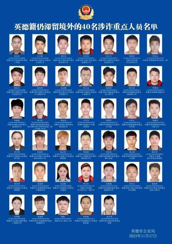 据广东省英德市公安局消息,11月17日,英德市公安局发布关于敦促英德籍滞留境外涉诈重点人员限期回国的通告,敦促40名涉诈重点人员必须于2023年12月15日前回国。