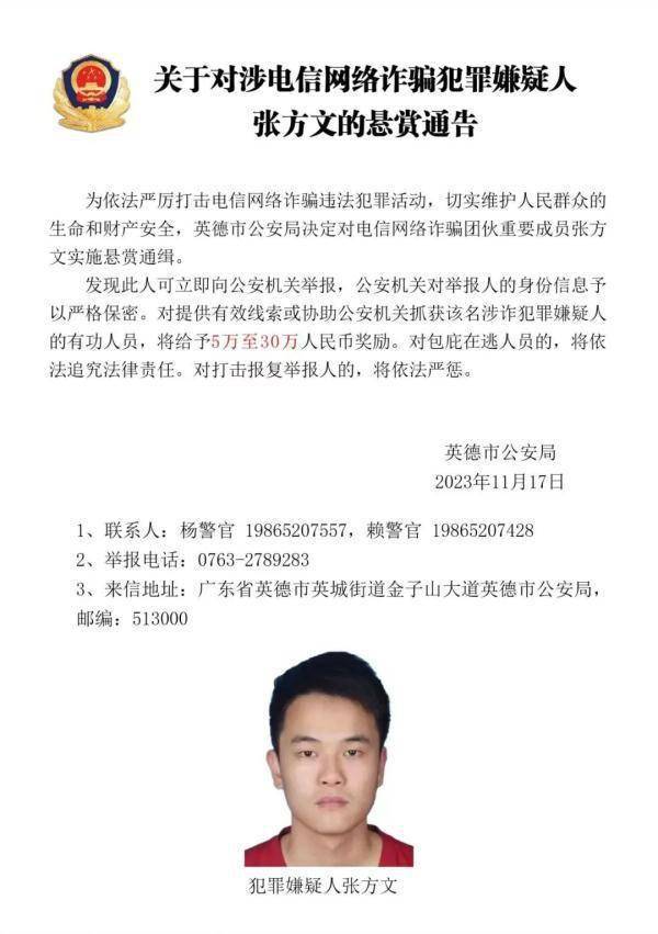 此外,英德市公安局发布关于对7名涉电信网络诈骗犯罪嫌疑人的悬赏通告,明确对提供有效线索或协助公安机关抓获涉诈犯罪嫌疑人的有功人员,将给予5万至30万元人民币奖励。