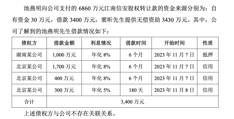 对于资金来源,豆神教育在回复针对上述问题下发的关注函时提到,池燕明向公司支付的股权转让款,包括30万元自有资金、3400万元借款、窦昕无偿资助3430万元。其中,借款分别来自北京、湖南的4家公司,借款时间为6个月,年化利息在5%-8%之间。