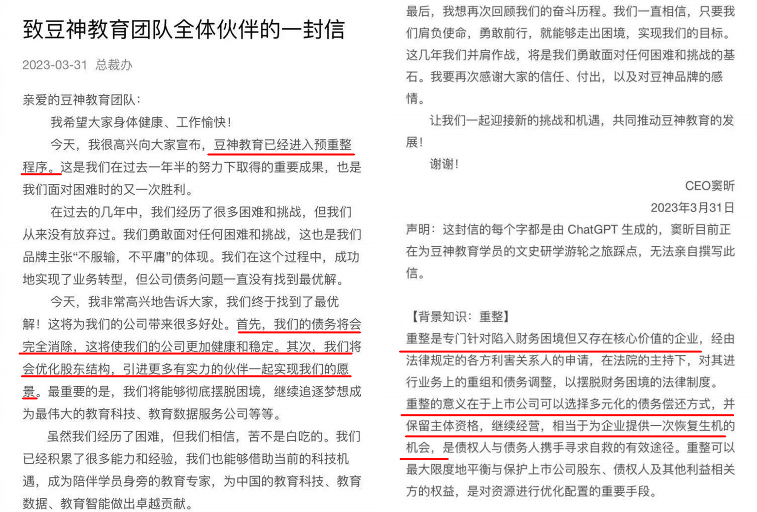 在公开信中,还附上了一段“背景知识”,称“重整是专门针对陷入财务困境但又存在核心价值的企业”,“重整的意义在于上市公司可以选择多元化的债务偿还方式,并保留主体资格,继续经营,相当于为企业提供一次恢复生机的机会”。