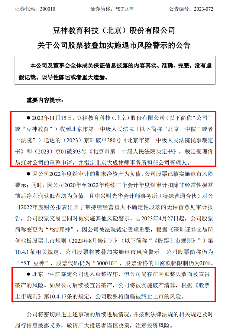 对于预重整后的未来,豆神教育似乎也有些拿不准。在公告中,豆神教育提示,北京一中院裁定公司进入重整程序,但公司尚存在因重整失败而被宣告破产的风险。如果公司后续被宣告破产,公司将被实施破产清算,根据《股票上市规则》规定,公司股票将面临被终止上市的风险。