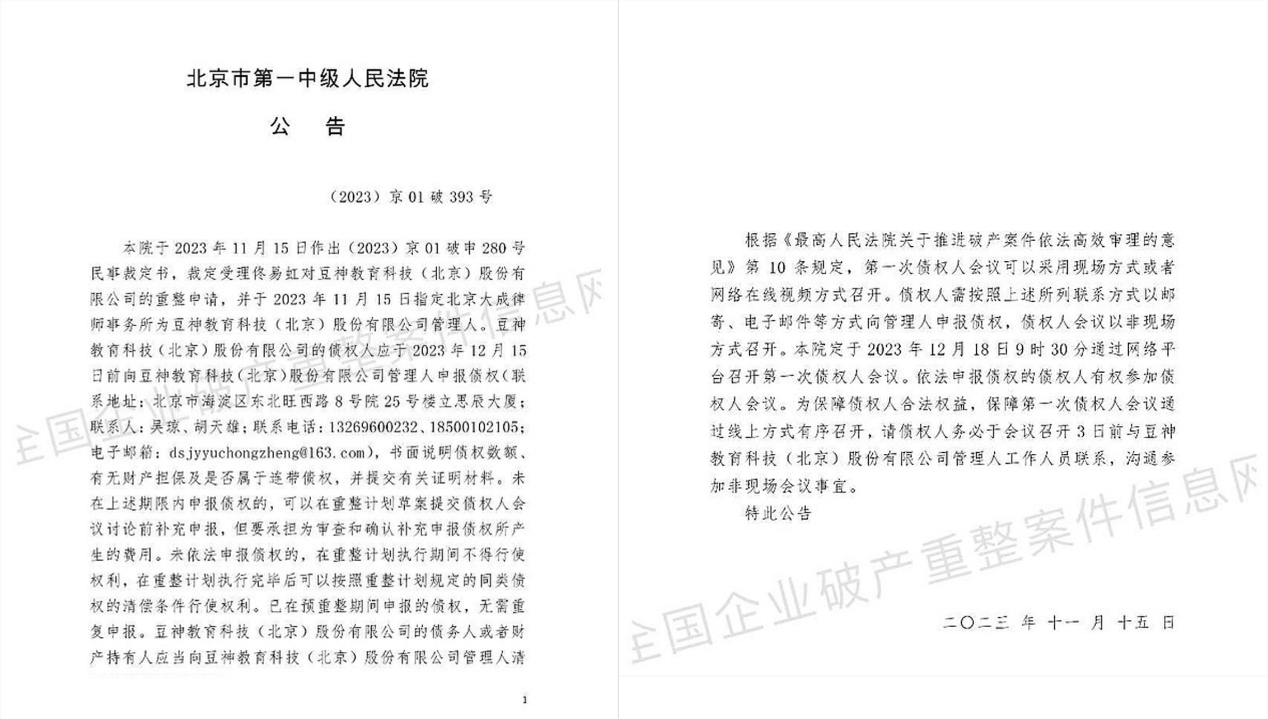 法院发布的受理破产清算申请公告显示,北京一中院于11月15日裁定受理佟易虹对豆神教育的重整申请,并指定管理人,豆神教育债权人应于12月15日前向管理人申报债权,法院定于12月18日通过网络平台召开第一次债权人会议。
