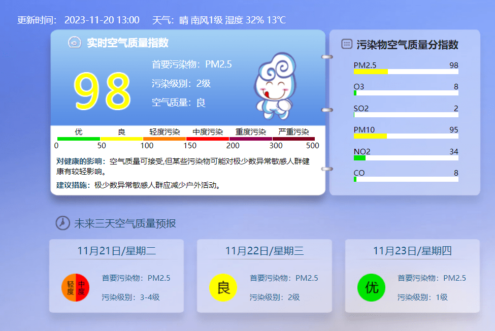 @北京环境监测 11月20日13时的实时空气质量指数,北京目前的污染级别达到2级,东城、西城、朝阳、丰台、通州、房山、大兴等区已显示为轻度污染。