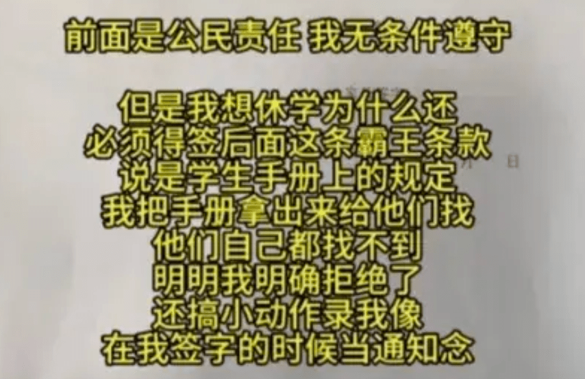 休学是我的权利,为何非要我签“不得发布影响学校名誉言论”的协议。“僧丫”表示老师称这是申请休学的必要步骤,是学校规定;但他要求拿出以前的“规定内容”却没有。