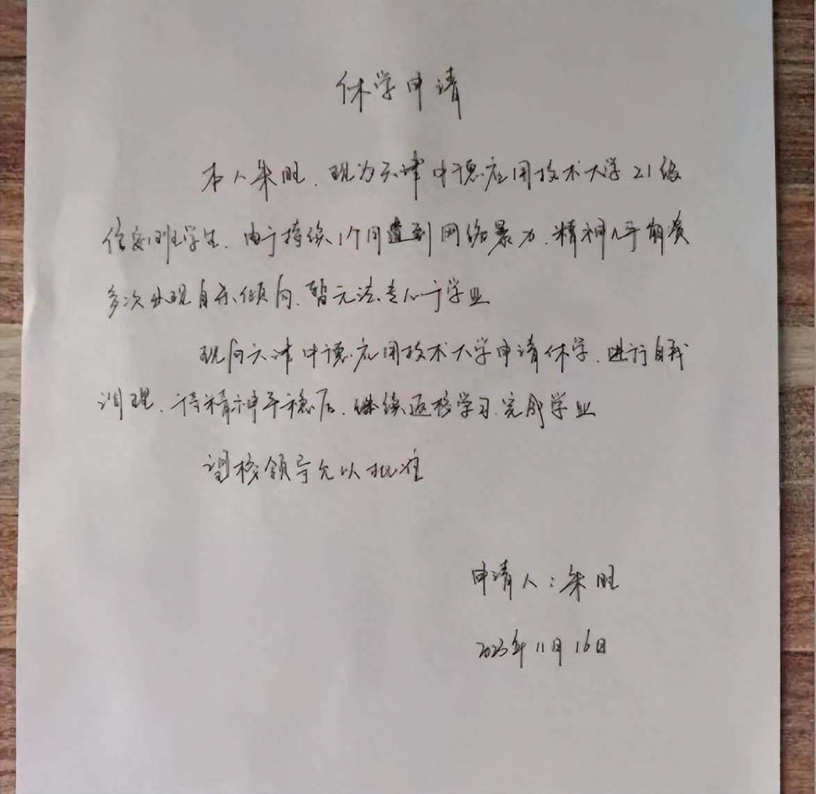 总之,闹到这个地步,朱同学估计在学校是很难有“好日子”的。即使申请休学,也跟普通同学不一样。他还在申请书里自称“有多次轻生倾向”。