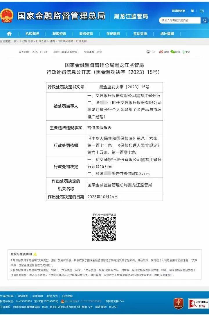 国家金融监督管理总局网站近日公布的行政处罚信息公开表显示,10月26日,交通银行股份有限公司黑龙江省分行因提供虚假报表被处罚款15万元。张某某(时任交通银行股份有限公司黑龙江省分行个人金融部个金产品与市场推广经理)被处警告并处罚款0.3万元。