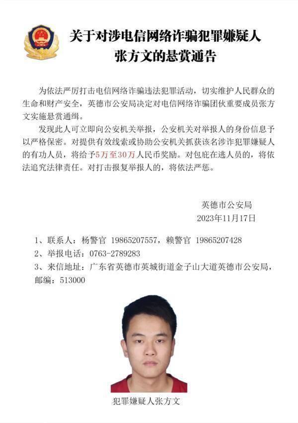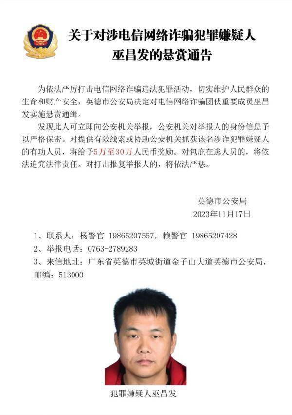 据“英德公安”微信公众号消息,近日,广东英德市公安局发布悬赏通告,对电信网络诈骗团伙重要成员张永胜、丘小雄、徐培星、张方文、巫昌发、邓宝运、邓海坚实施悬赏通缉。发现上述人员可立即向公安机关举报,对提供有效线索或协助公安机关抓获该名涉诈犯罪嫌疑人的有功人员,将给予5万至30万元人民币奖励。详细内容如下: