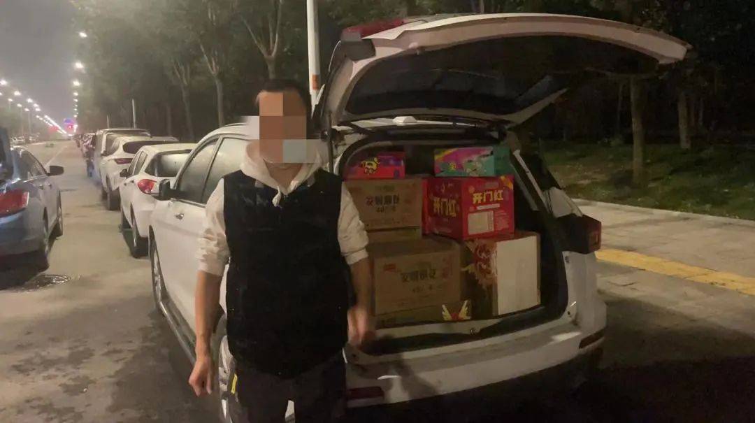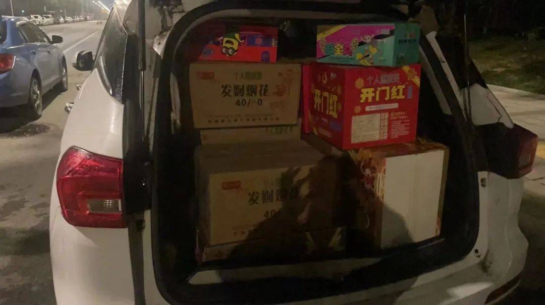11月12日凌晨4时许,民警在巡逻时发现一辆白色哈佛SUV停在路边,车内无人但撑着一把雨伞,似乎在遮挡着什么,十分可疑,民警立即上前检查,发现车内装载了满满当当一车烟花爆竹,存在严重安全隐患。