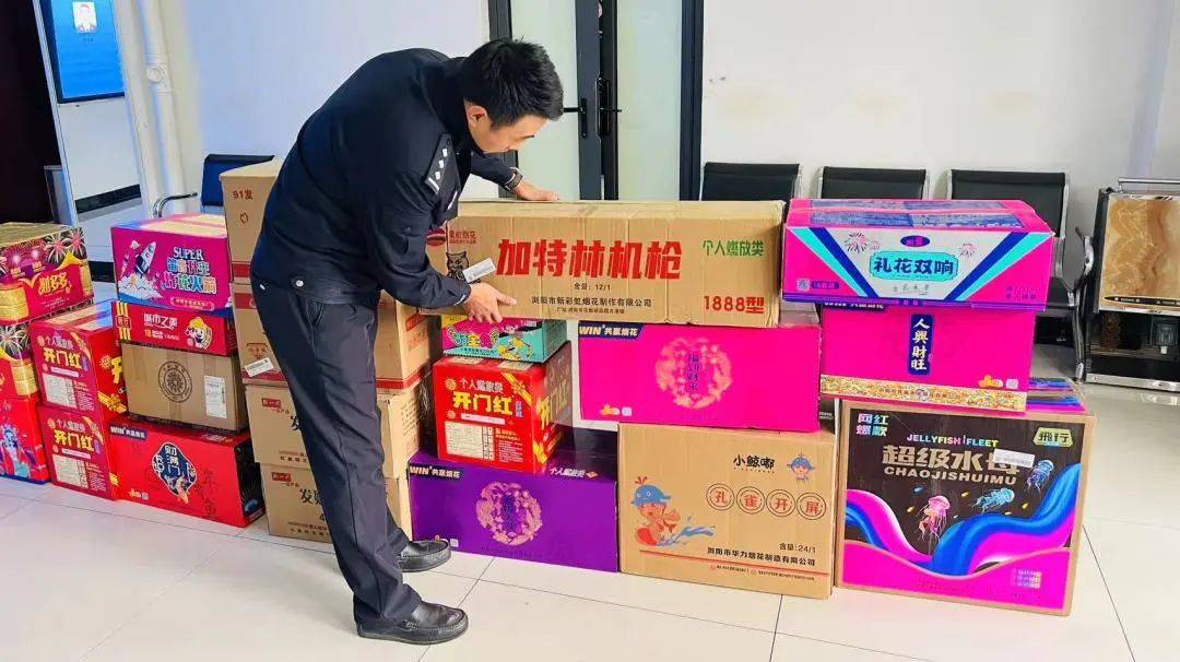 随后,民警将涉嫌非法运输存储危险物质的违法行为人赵某控制,并现场查获烟花爆竹22箱,品类30余种。