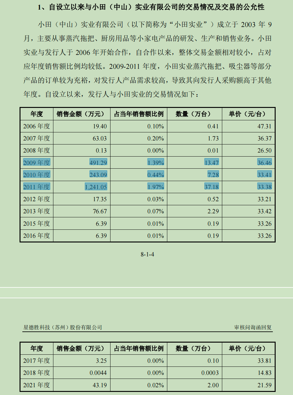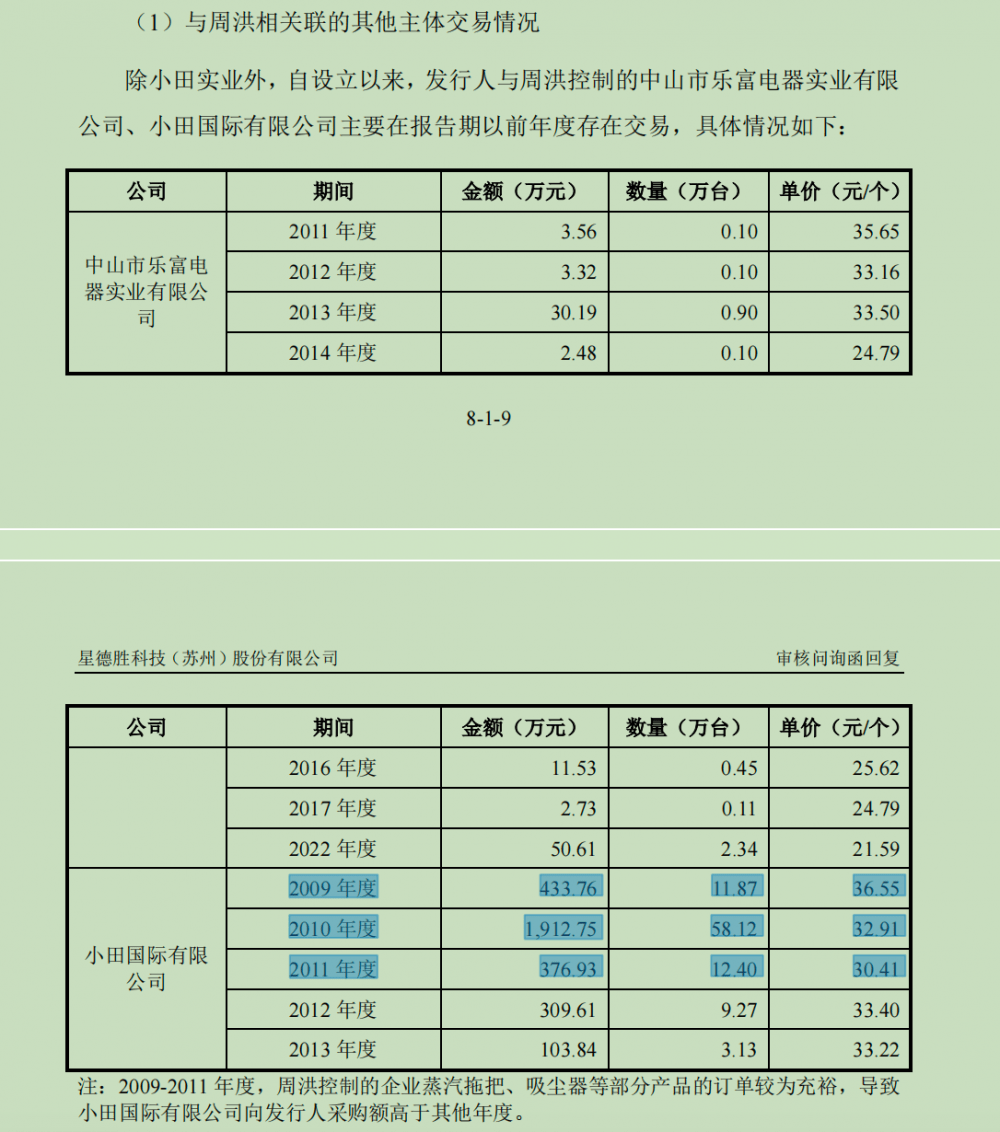 星德胜在回复函透露,报告期内(2020 年--2022 年),星德胜向周洪控制的小田(中山)实业有限公司销售微特电机,交易额分别为0万元、43.19万元、0万元,向SHI HONG控制的江苏戴维轴承有限公司采购轴承,交易额分别为163.56万元、258.00万元、524.26万元,两人分别系星德胜客户与供应商的实际控制人。