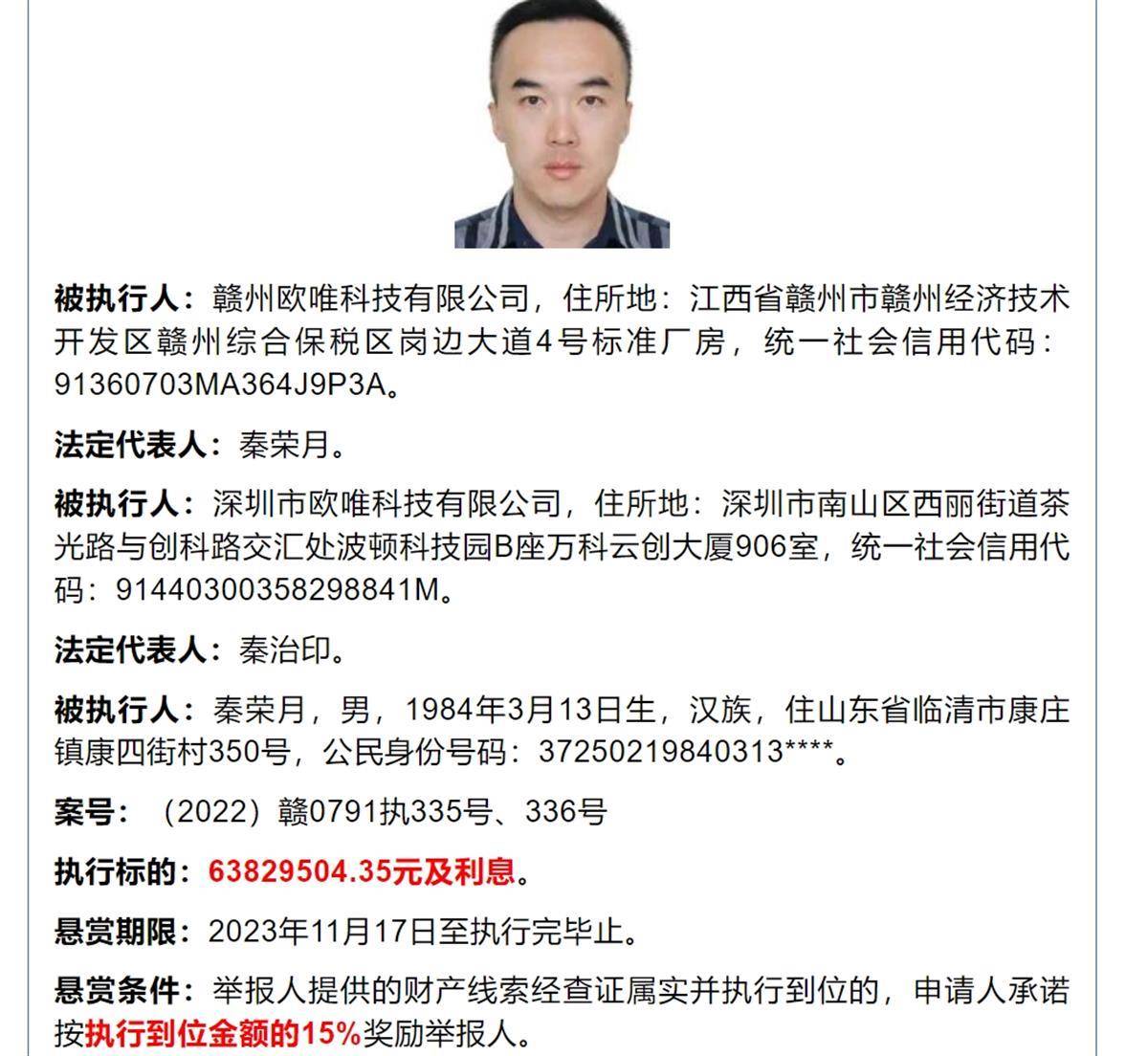 赣州经济技术开发区人民法院官方微信公众号发布了四则悬赏公告,其中一则的被执行人分别为赣州欧唯科技有限公司、深圳市欧唯科技有限公司,执行标的为63829504.35元及利息,所开出的悬赏为,“举报人提供的财产线索经查证属实并执行到位的,申请人承诺按执行到位金额的15%奖励举报人。”