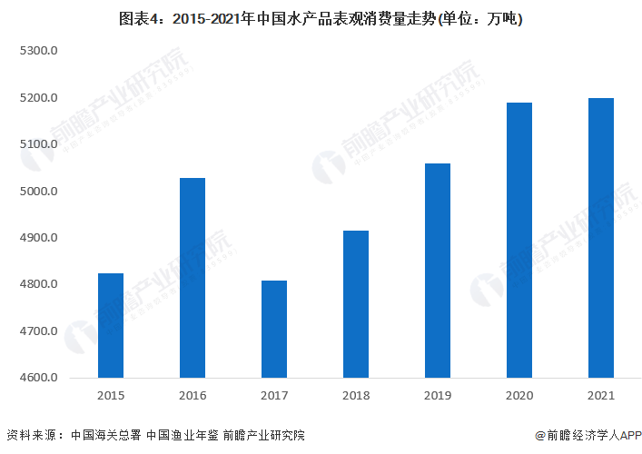 随着农产品电子商务快速发展,水产品流通渠道不断拓展,并带动消费增长。2016年中国水产品表观消费量超过5000万吨后,2017年中国水产品表观消费量开始出现明显下滑,主要是受到淡水养殖面积的减少,2017-2021年中国水产品表观消费量持续走高,初步统计2021年中国水产品表观消费量接近5200万吨。