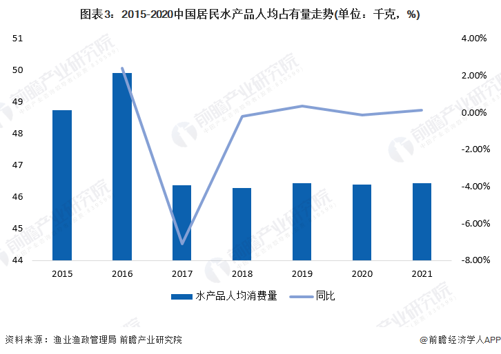2015-2020年,中国居民水产品人均占有量趋于稳定,均在45千克以上,2017年后稳定在46千克左右,2020年中国居民水产品人均占有量为46.39千克,初步统计2021年中国居民水产品人均占有量仍旧在46kg左右。