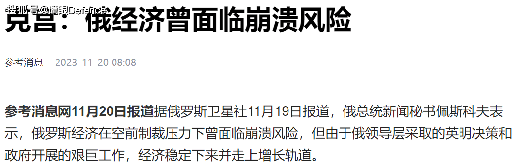相比乌克兰,克里姆林宫倒是保持了一贯的乐观和自信,在接受俄罗斯第一频道“莫斯科·克里姆林宫·普京”栏目采访时,克里姆林宫发言人、俄罗斯总统新闻秘书佩斯科夫宣称,俄罗斯遭受了前所未有的经济制裁,还在此之前经历了两年新冠疫情的严峻考验,但通过有效的经济措施和金融措施,俄罗斯不仅成功阻止了经济的崩溃,还实现了接近3%的增长,“世界上没有一个国家曾经遭遇过如此大的打击,而且从理论上说也没有一个国家能够经受得住。”