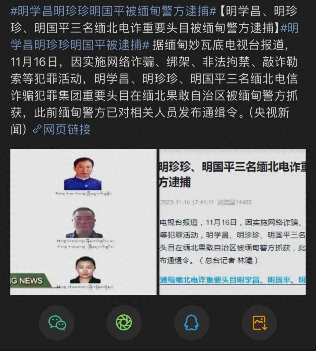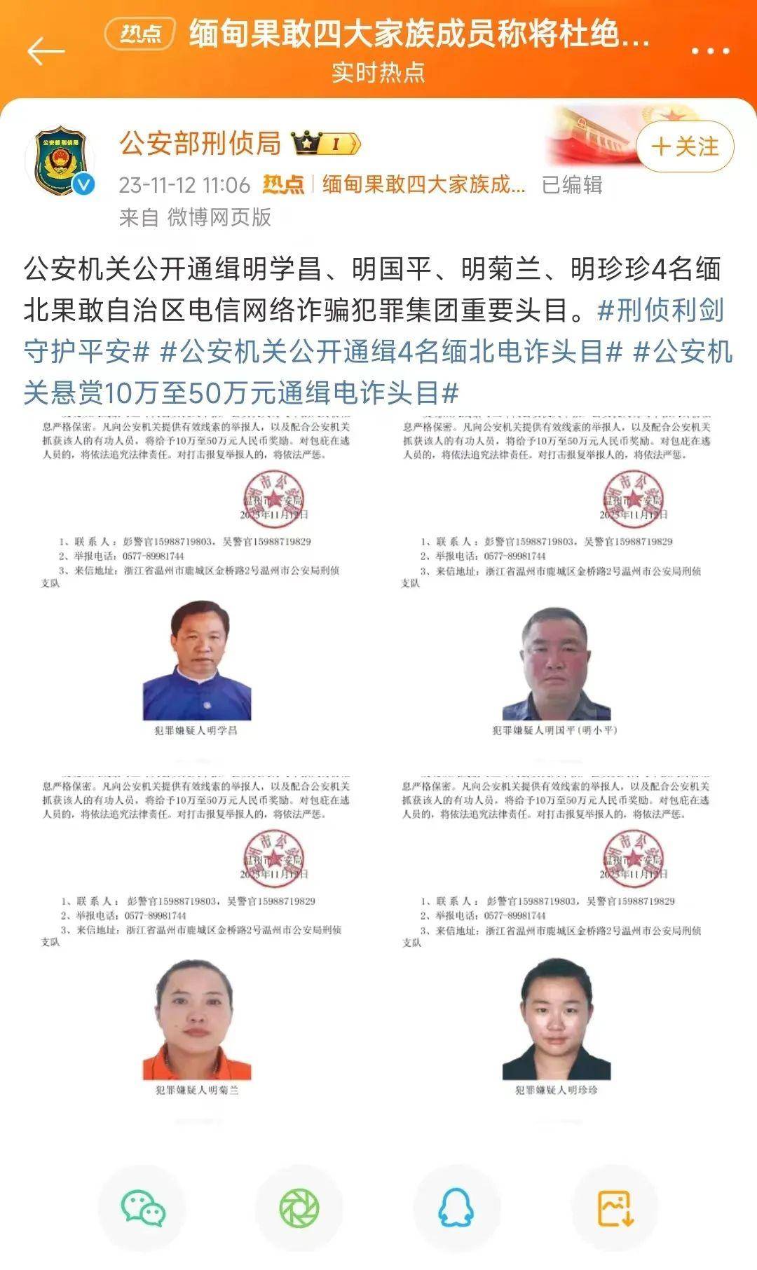 据中国警察网11月16日消息,当天,在缅甸各方的配合下,于上周日(11月12日)被我国警方通缉的缅甸掸邦一特(果敢)明氏家族电信、网络诈骗犯罪集团全军覆灭,三个在通缉令上的罪犯明国平、明菊兰、明珍珍被移交给我国警方。