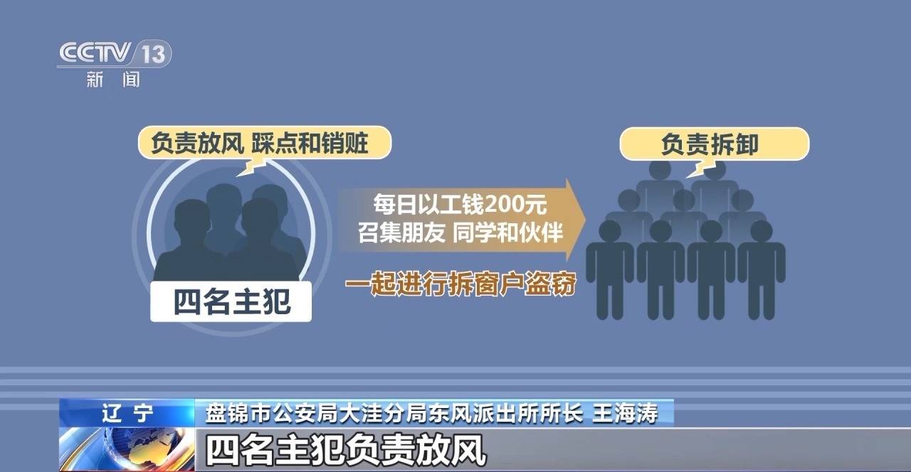 辽宁省盘锦市公安局大洼分局东风派出所所长 王海涛:我们发现这个犯罪团伙有严密的架构。有四名主犯作为召集人,然后每日以工钱200元召集他们的朋友、同学和伙伴一起进行拆窗户盗窃。这些被召集的人负责拆卸,四名主犯负责放风、踩点和销赃。