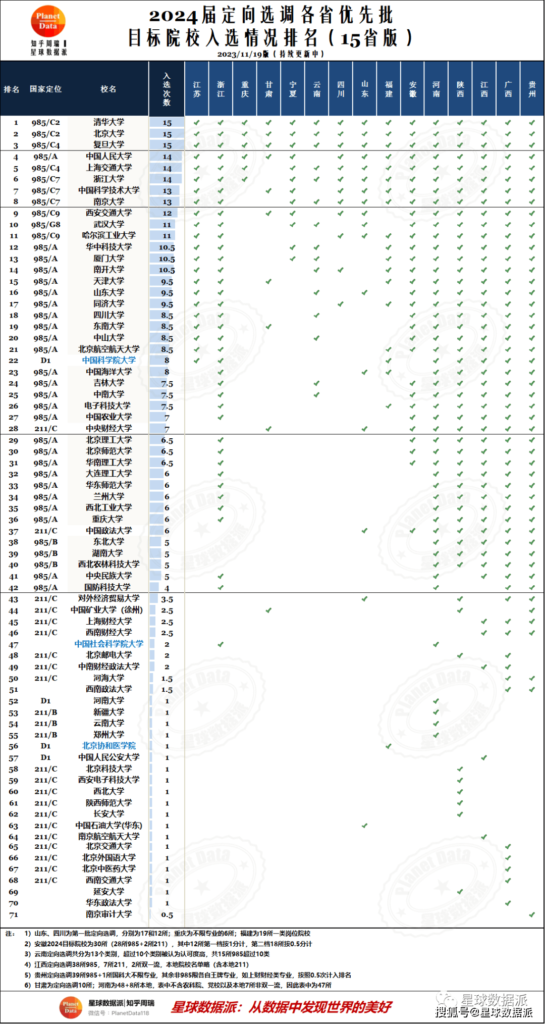今天我们一起来盘点河南、陕西公布后15省最新版本各大名校入围次数以及河南、陕西两省的具体名单。