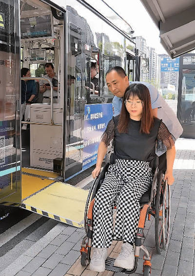 日前在江苏苏州的劳动路实验小学公交车站,公交车驾驶员协助坐轮椅的乘客乘坐无障碍公交车。 王 鹏摄