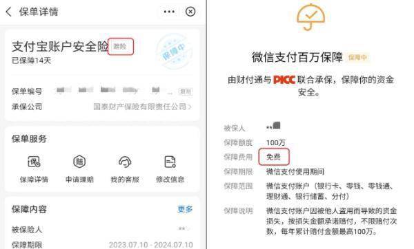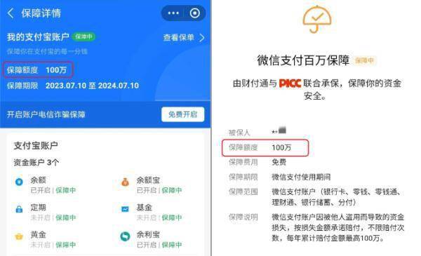支付宝“百万保障”账户安全险则由支付宝公司免费赠送,保期一年,到期后可免费自动续保。