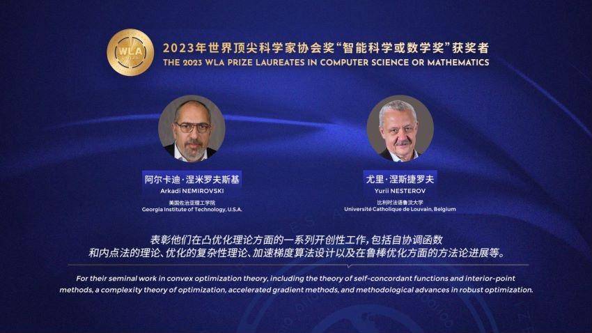 “智能科学或数学奖”授予美国佐治亚理工学院工业与系统工程学院讲席教授阿尔卡迪·涅米罗夫斯基(Arkadi Nemirovski)和比利时法语鲁汶大学运筹学与计量经济学中心、数学工程系名誉教授、高级科学研究员尤里·涅斯捷罗夫(Yurii Nesterov)。据了解,这两位数学家均为俄罗斯裔。